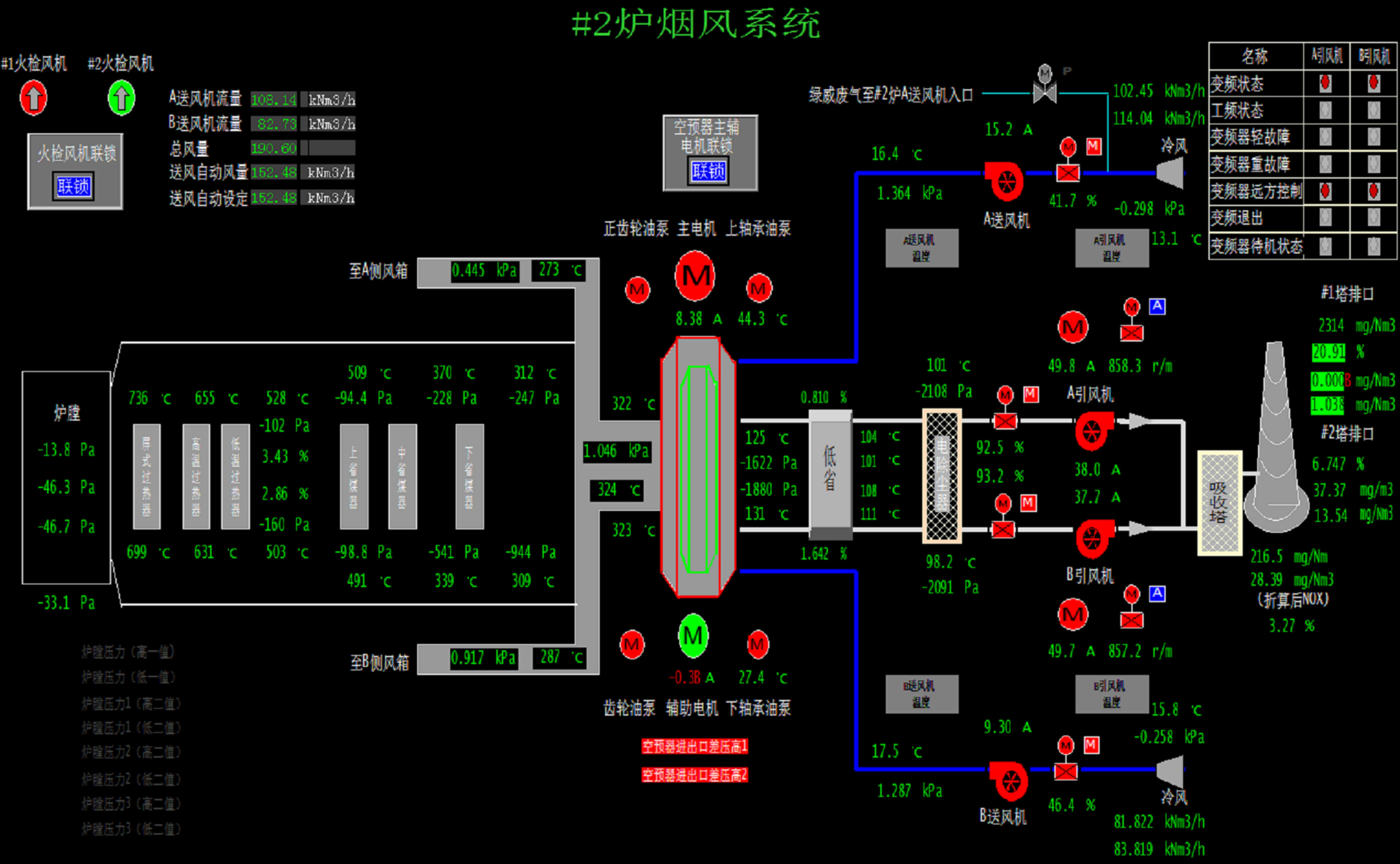 克服风烟系统阻力,保持锅炉负压在-60Pa运行,转速调节范围0~992r/min。运行工况未变化的情况下,引风机转速增加,需要查明原因。
