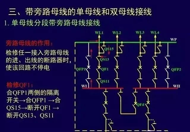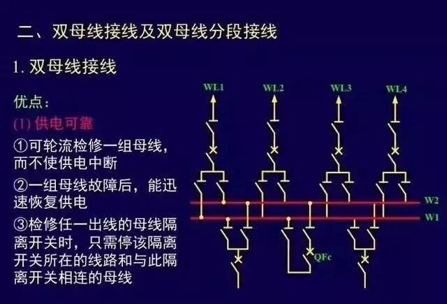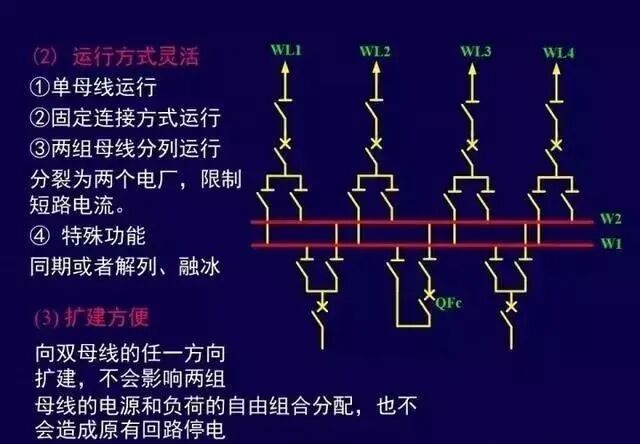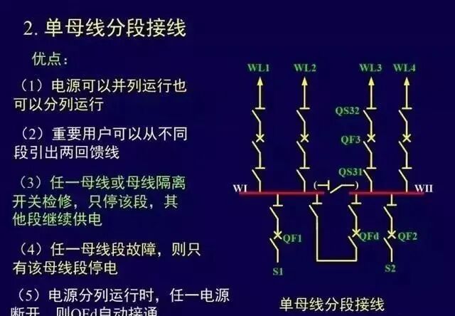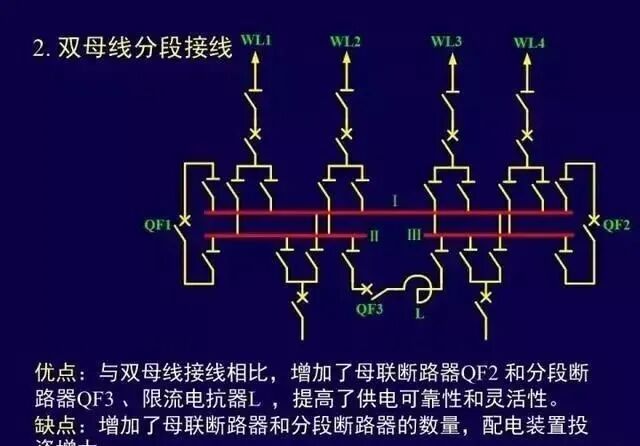 缺点:增了分段设备的投资和占地面积;某段母线故障或检修仍有停电问题;某回路的断路器检修,该回路停电;扩建时,需向两端均衡扩建。